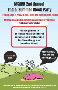 « All Events This event has passed. MSABD 2nd Annual End o’ Summer Block Party September 8, 2023 @ 4:00 pm - 6:00 pm « CALS portrait session for faculty, staff and graduate students Graduate Student Seminar by Jessica Brown » Add to calendar Google Calendar iCalendar Outlook 365 Outlook Live Details Date: September 8, 2023 Time: 4:00 pm - 6:00 pm Event Categories: Faculty/Staff Events, Graduate Program Events Organizer Department of Animal & Dairy Sciences Phone (608) 263-3308 Venue Meat Science and Animal Biologics Building 1933 Observatory Drive Madison, Wisconsin 53706 + Google Map